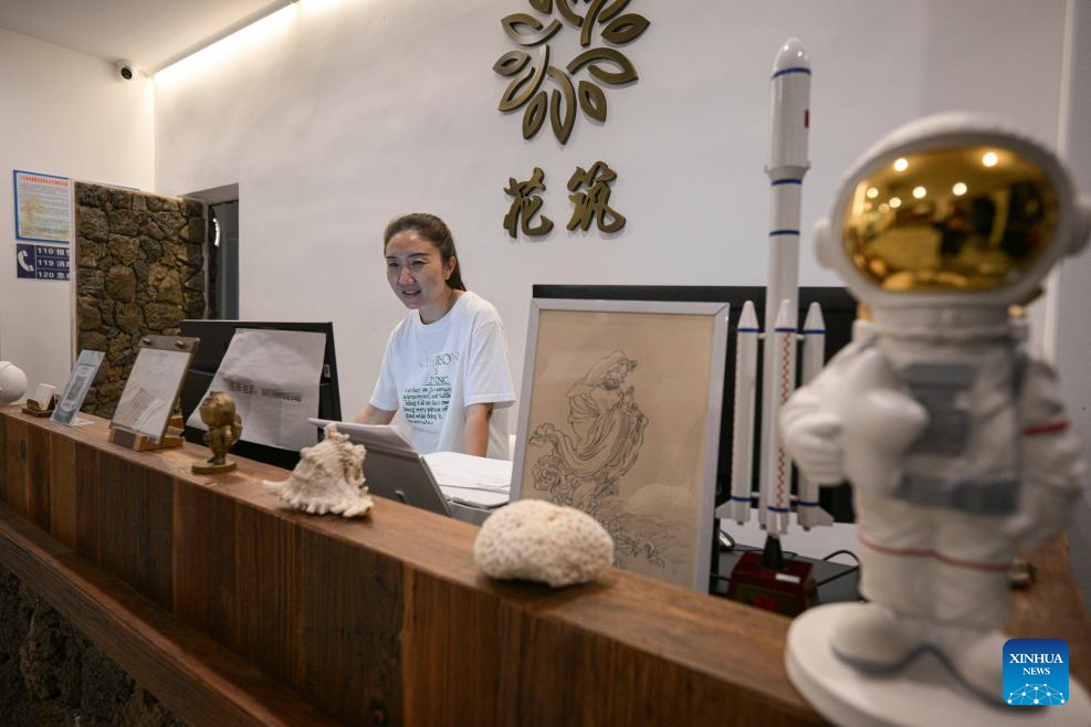 A homestay owner works at her reception desk in Longlou Town of Wenchang City, south China's Hainan Province, Dec. 24, 2025. (Xinhua/Pu Xiaoxu)