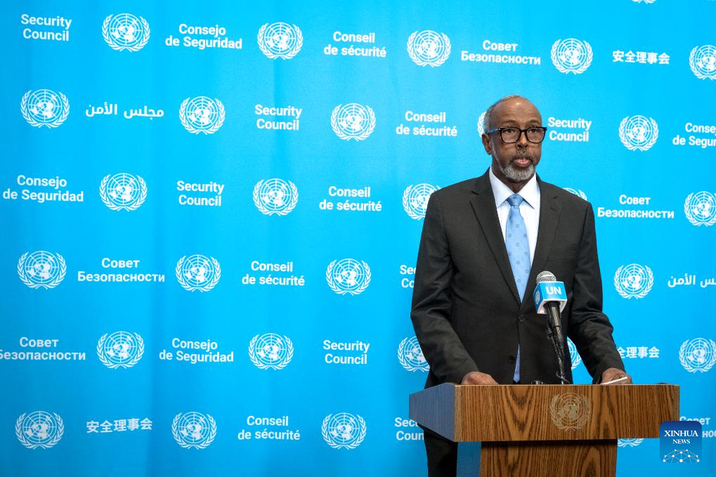 Somali UN ambassador Abukar Dahir Osman speaks at a flag installation ceremony for the five new elected members of the Security Council in his capacity as president of the Security Council for the month of January and co-host, at the UN headquarters in New York, Jan. 2, 2026. Bahrain, Colombia, the Democratic Republic of the Congo, Latvia and Liberia on Friday began to assume responsibilities as non-permanent members of the UN Security Council. (Mark Garten/UN Photo/Handout via Xinhua)