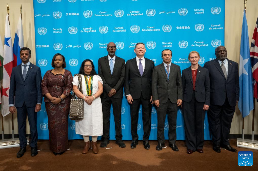Photo taken on Jan. 2, 2026 shows a flag installation ceremony to mark the start of the responsibilities of the five countries as non-permanent members of the Security Council at the UN headquarters in New York. Bahrain, Colombia, the Democratic Republic of the Congo, Latvia and Liberia on Friday began to assume responsibilities as non-permanent members of the UN Security Council. (Mark Garten/UN Photo/Handout via Xinhua)