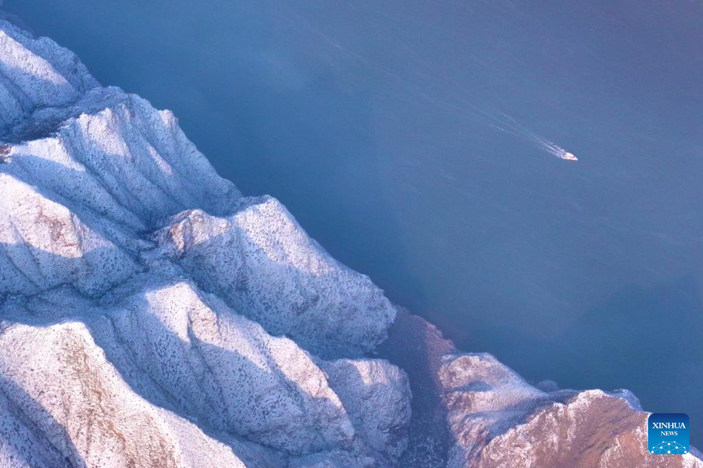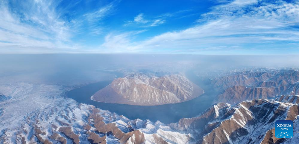 An aerial drone photo taken on Jan. 2, 2026 shows a view of the Yellow River after snowfall in Qingtongxia, northwest China's Ningxia Hui Autonomous Region. (Photo by Yuan Hongyan/Xinhua)