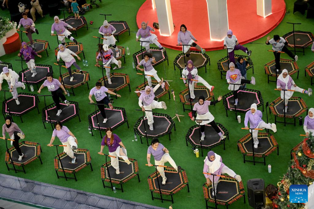 People participate in trampoline exercise at a mall in Tangerang, Banten province, Indonesia, Jan. 3, 2026. (Photo by Agung Kuncahya B./Xinhua)