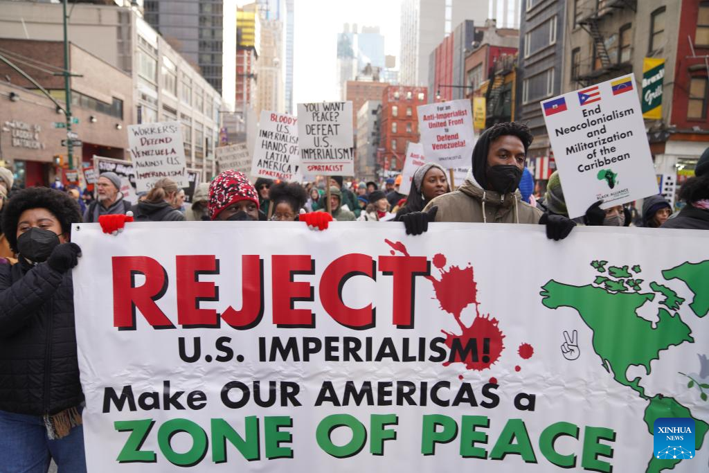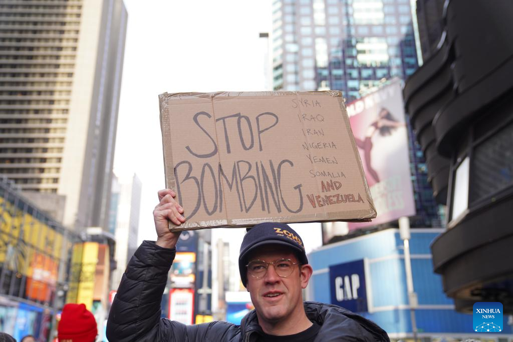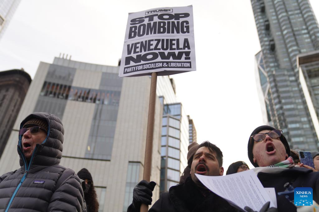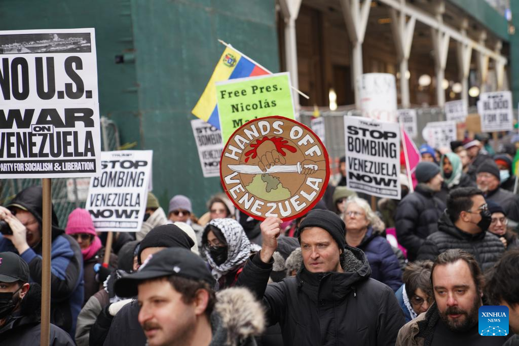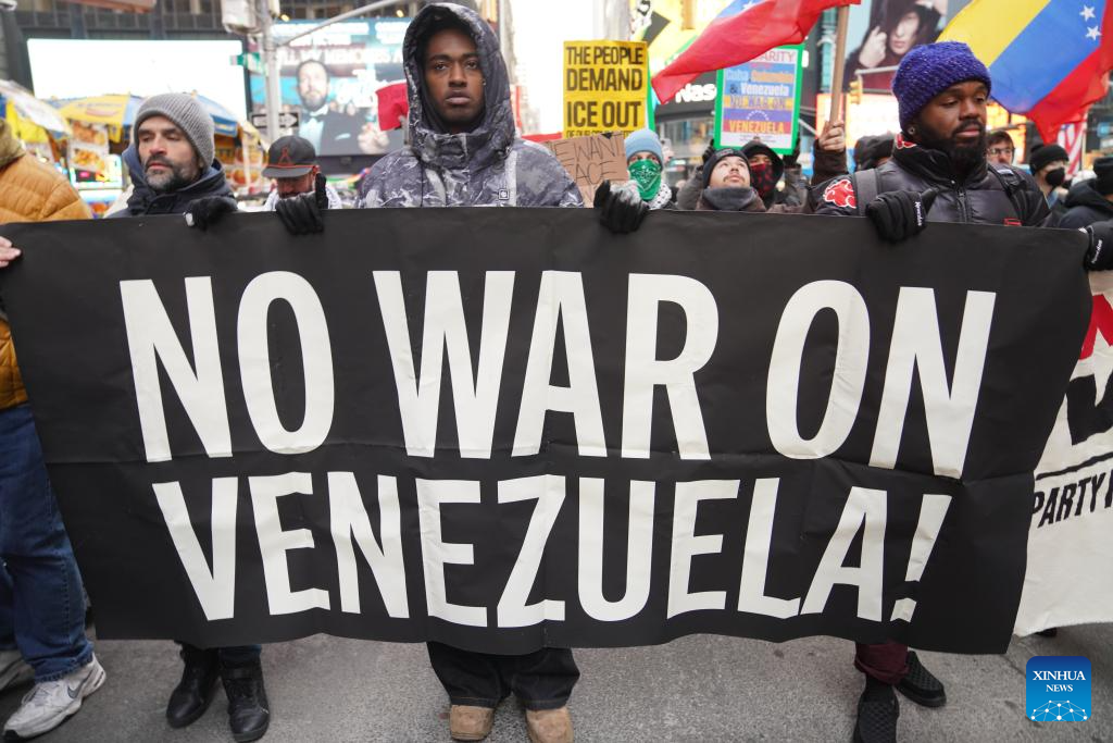 People take part in a protest against U.S. attacks on Venezuela in New York city, the United States, on Jan. 3, 2026. The U.S. military launched a series of attacks against Venezuela early Saturday morning, reportedly capturing Venezuelan President Nicolas Maduro and flying him out of the country. (Xinhua/Zhang Fengguo)