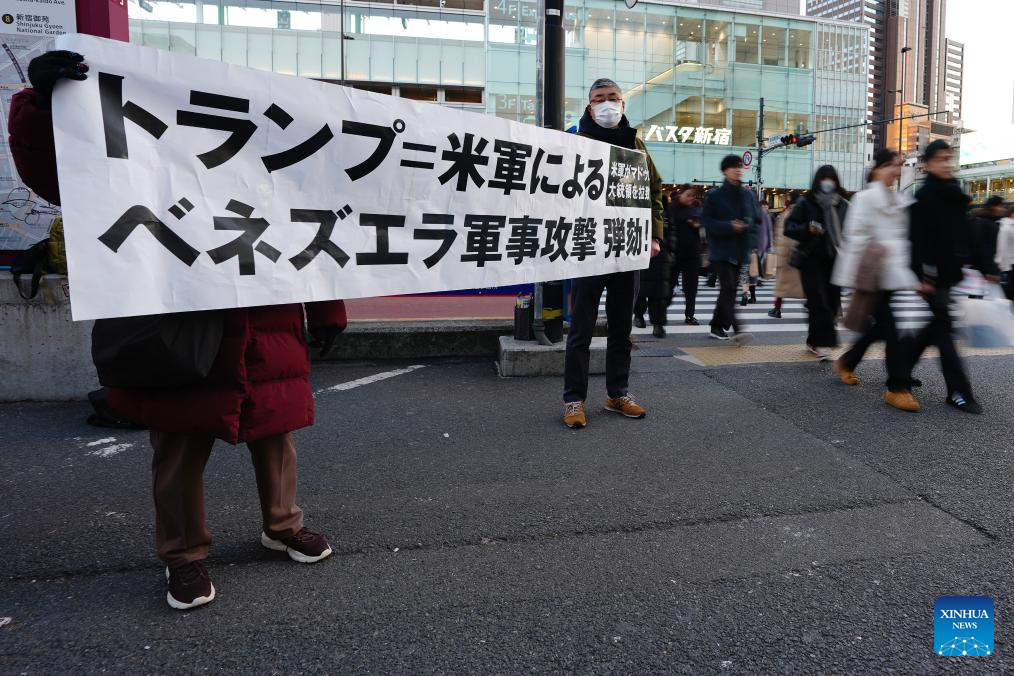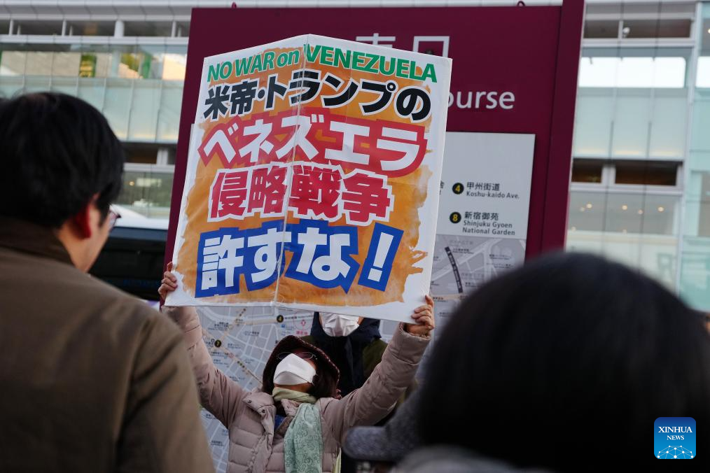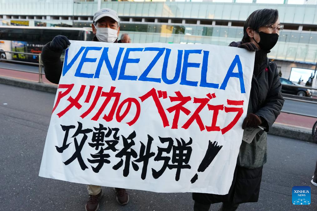 People hold a slogan in support of Venezuela during a demonstration in Tokyo, Japan, Jan. 4, 2026. The U.S. military strike against Venezuela and capture of its president, Nicolas Maduro, has shocked the international community, triggering a steady stream of condemnation and serious concerns worldwide. (Xinhua/Jia Haocheng)