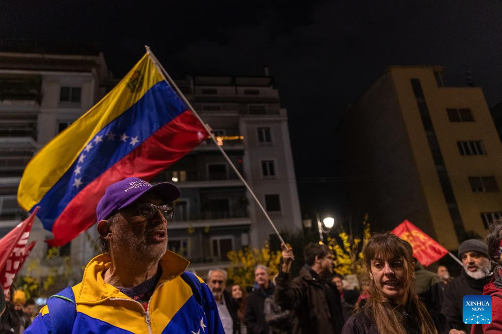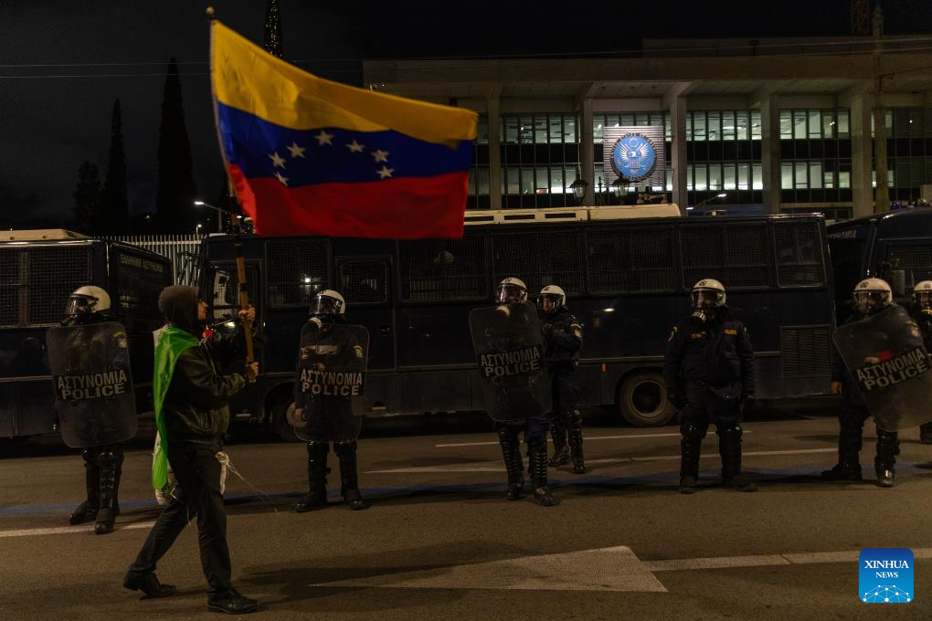People in support of Venezuela protest outside the U.S. Embassy in Athens, Greece, Jan. 3, 2026. The U.S. military strike against Venezuela and capture of its president, Nicolas Maduro, has shocked the international community, triggering a steady stream of condemnation and serious concerns worldwide. (Xinhua/Marios Lolos)