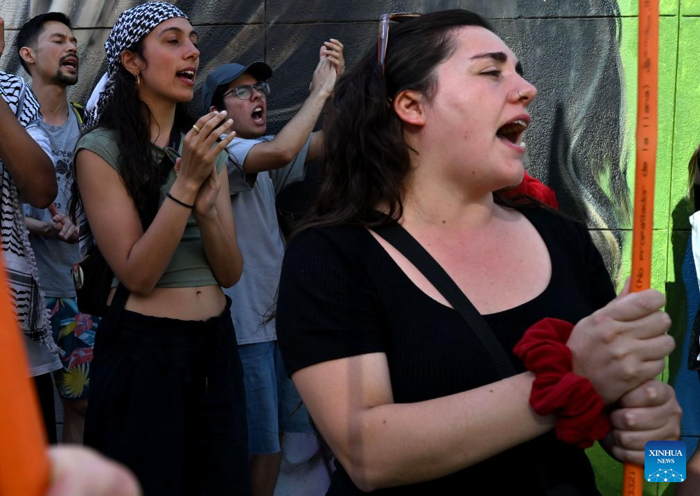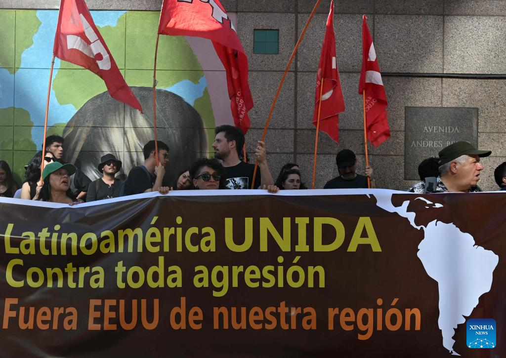 People in support of Venezuela protest outside the U.S. Embassy in Santiago, Chile, Jan. 3, 2026. The U.S. military strike against Venezuela and capture of its president, Nicolas Maduro, has shocked the international community, triggering a steady stream of condemnation and serious concerns worldwide. (Xinhua/Jorge Villegas)