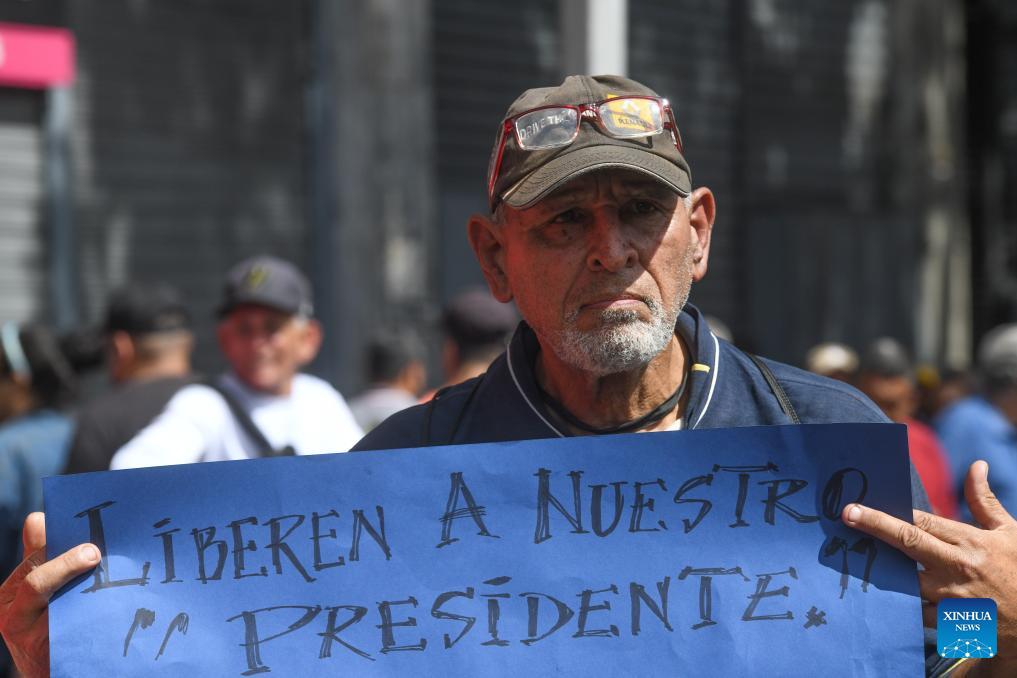 People in support of Venezuela hold a placard outside the Venezuelan Embassy in Brasilia, Brazil, on Jan. 3, 2026. The U.S. military launched a series of attacks against Venezuela early Saturday morning, reportedly capturing Venezuelan President Nicolas Maduro and flying him out of the country. (Photo by Lucio Tavora/Xinhua)