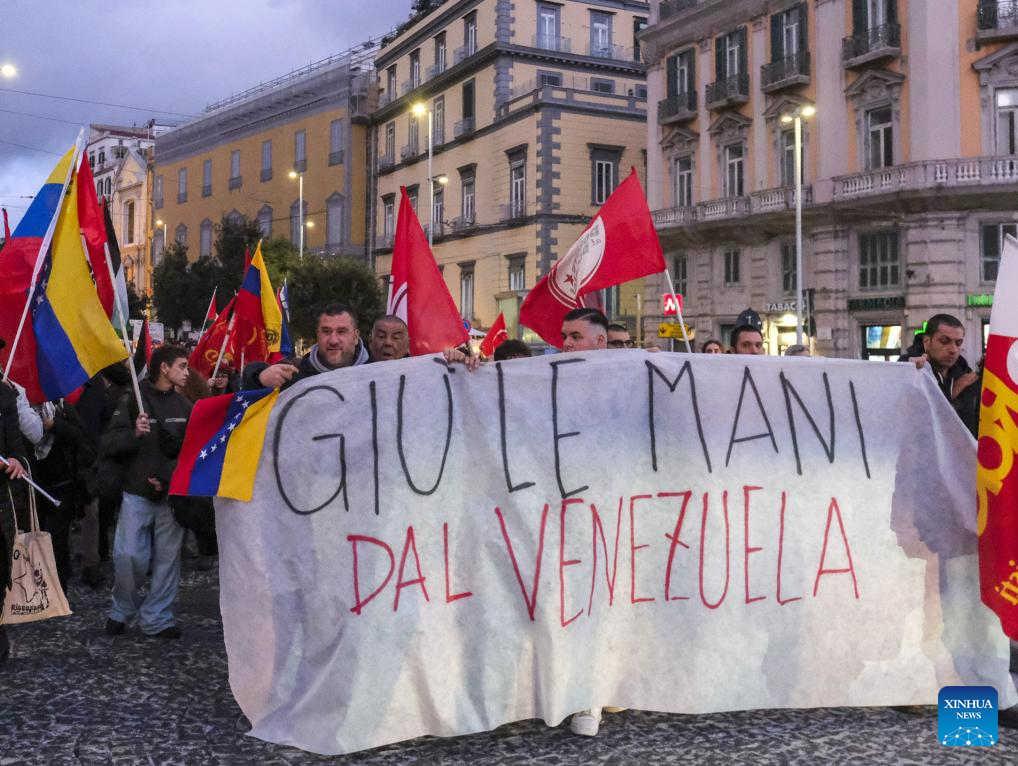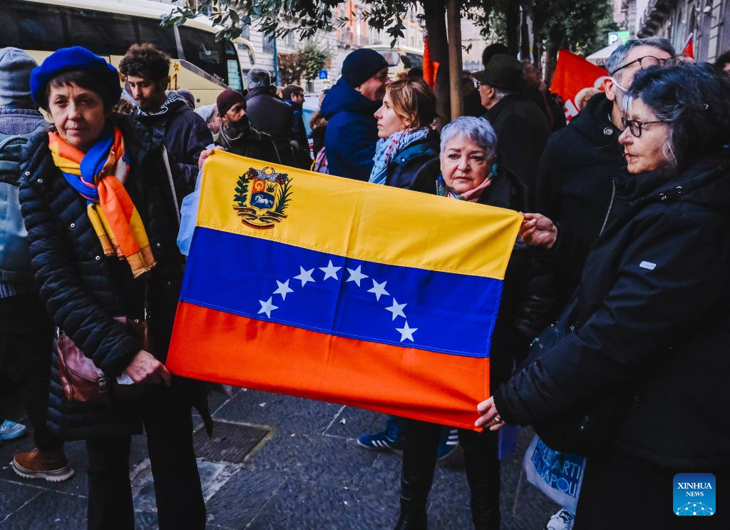 People hold a banner in support of Venezuela during a demonstration in Naples, Italy, Jan. 3, 2026. The U.S. military strike against Venezuela and capture of its president, Nicolas Maduro, has shocked the international community, triggering a steady stream of condemnation and serious concerns worldwide. (Xinhua)