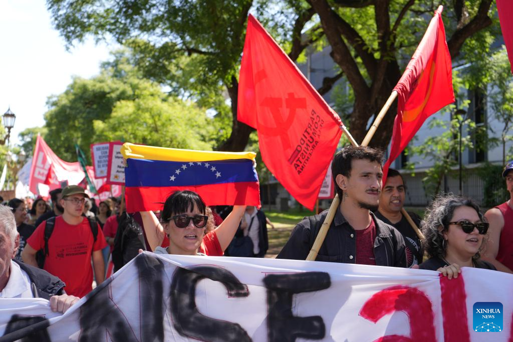 People in support of Venezuela protest outside the U.S. Embassy in Buenos Aires, Argentina, on Jan. 3, 2026. The U.S. military launched a series of attacks against Venezuela early Saturday morning, reportedly capturing Venezuelan President Nicolas Maduro and flying him out of the country. (Xinhua/Zhang Duo)