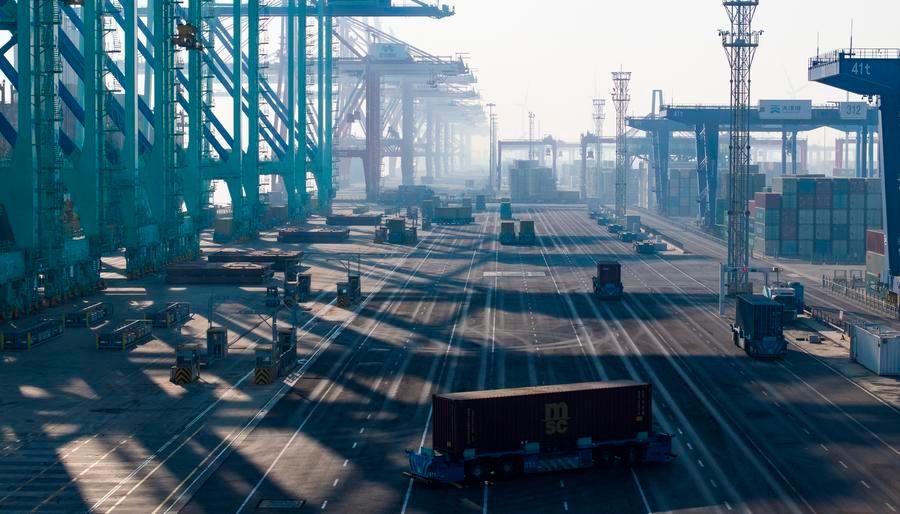 A staff member checks goods in stock at a terminal of a subsidiary of Tianjin Port Holdings Co., Ltd. at Tianjin Port in north China's Tianjin, Jan. 2, 2026. (Xinhua/Zhao Zishuo)A drone photo taken on Jan. 3, 2026 shows a smart transportation robot (front) moving a container at a container terminal of Tianjin Port in north China's Tianjin. (Xinhua/Zhao Zishuo)A drone photo taken on Jan. 3, 2026 shows a view of a container terminal at Tianjin Port in north China's Tianjin. (Xinhua/Zhao Zishuo)A drone photo taken on Jan. 2, 2026 shows a view of a terminal of a subsidiary of Tianjin Port Holdings Co., Ltd. at Tianjin Port in north China's Tianjin. (Xinhua/Zhao Zishuo)A drone photo taken on Jan. 2, 2026 shows a cargo ship departing from a terminal of a subsidiary of Tianjin Port Holdings Co., Ltd. at Tianjin Port in north China's Tianjin. (Xinhua/Zhao Zishuo)Gantry cranes move containers at a container terminal of Tianjin Port in north China's Tianjin, Jan. 3, 2026. (Xinhua/Zhao Zishuo)