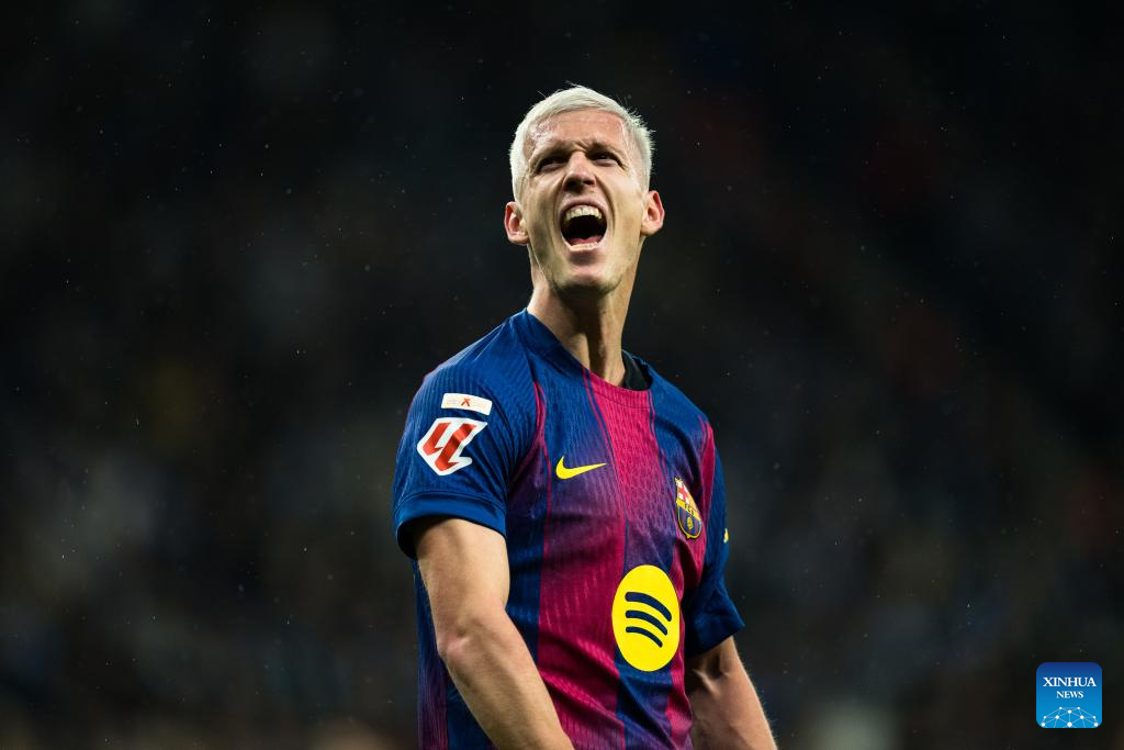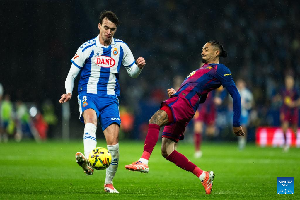 MADRID, Jan. 3 (Xinhua) -- La Liga leader FC Barcelona rode its luck before two late goals from Dani Olmo and Robert Lewandowski assured a 2-0 win away to local rivals Espanyol on Saturday.