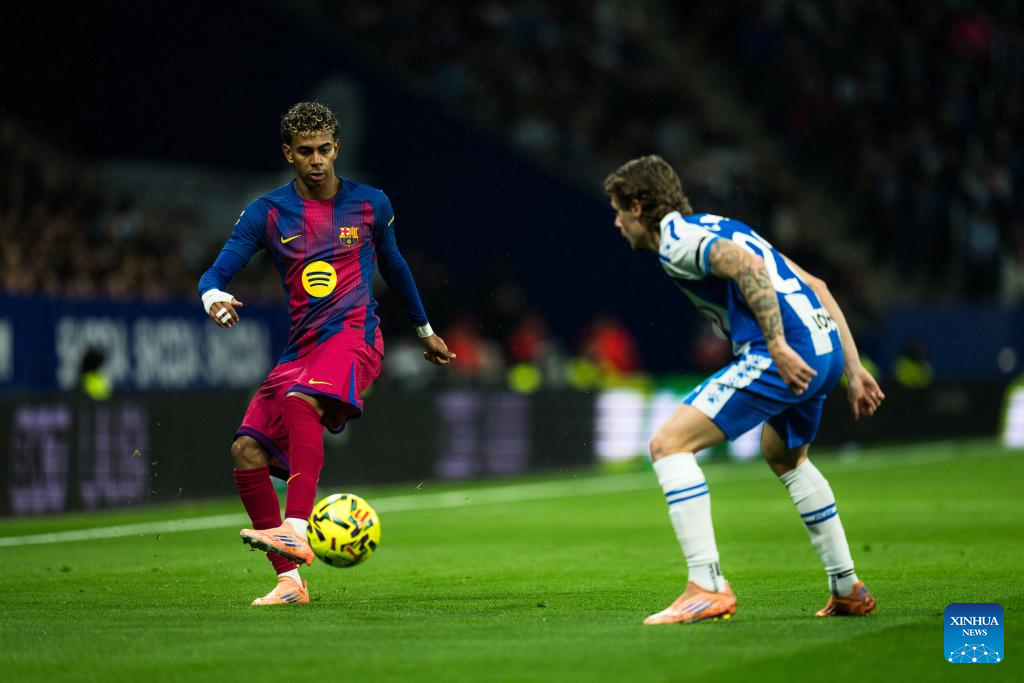 Barcelona's Lamine Yamal (L) controls the ball during LaLiga football match between RCD Espanyol and FC Barcelona in RCDE Stadium, Cornella, Barcelona, Spain, Jan. 3, 2026. (Photo by Joan Gosa/Xinhua)