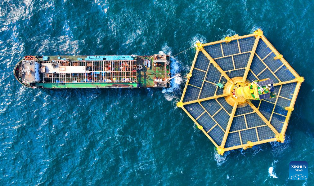 An aerial drone photo taken on Jan. 12, 2025 shows "Shenlan 2" (R), China's self-developed large deep-sea fish farming equipment, cooperating with an aquaculture vessel to collect fish at a fish farming experimental area of Qingdao, east China's Shandong Province. (Xinhua/Li Ziheng)