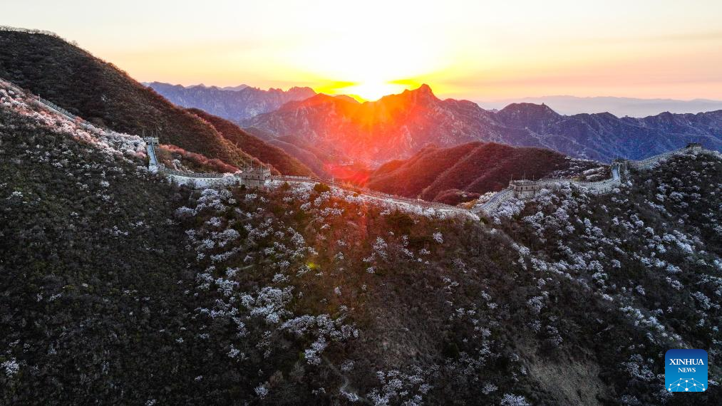 An aerial drone photo taken on April 5, 2025 shows a view of the Mutianyu section of the Great Wall at dawn in Beijing, capital of China. (Xinhua/Chen Yehua)