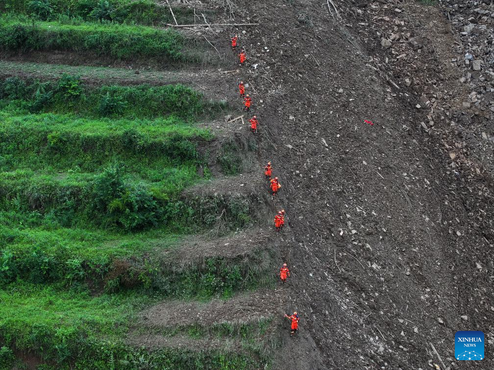 An aerial drone photo taken on May 22, 2025 shows rescue work underway after a landslide in Qingyang Village of Guowa Township in Dafang County of Bijie, southwest China's Guizhou Province. (Xinhua/Yang Wenbin)