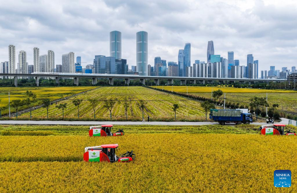 A drone photo taken on Oct. 21, 2025 shows harvesters harvesting rice in a paddy field, with a high-speed train in the background, in Hangzhou, east China's Zhejiang Province. (Xinhua/Xu Yu)