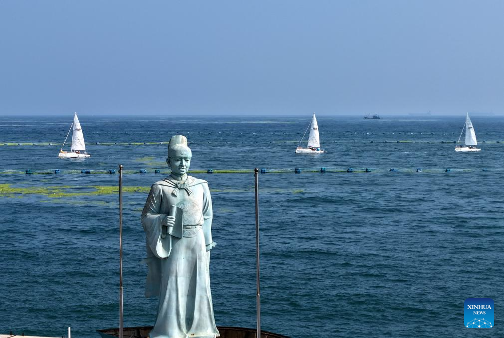 A drone photo taken on July 10, 2025 shows a statue of Chinese navigator and explorer Zheng He with sailboats participating in a sea cruising event in the background near a dock in Qingdao, east China's Shandong Province. The year 2025 marked the 20th anniversary of the establishment of the Maritime Day of China and the 620th anniversary of Zheng He's maritime voyages. (Xinhua/Li Ziheng)