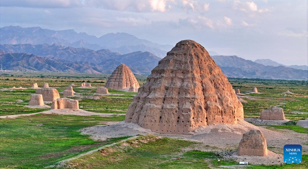 A drone photo taken on July 10, 2025 shows two mausoleums of the Xixia Imperial Tombs in northwest China's Ningxia Hui Autonomous Region. China's Xixia Imperial Tombs were officially added to the UNESCO World Heritage List on July 11, 2025 during the 47th session of the World Heritage Committee held in Paris, France. The inscription brings the total number of World Heritage sites in China to 60. (Xinhua/Wang Peng)