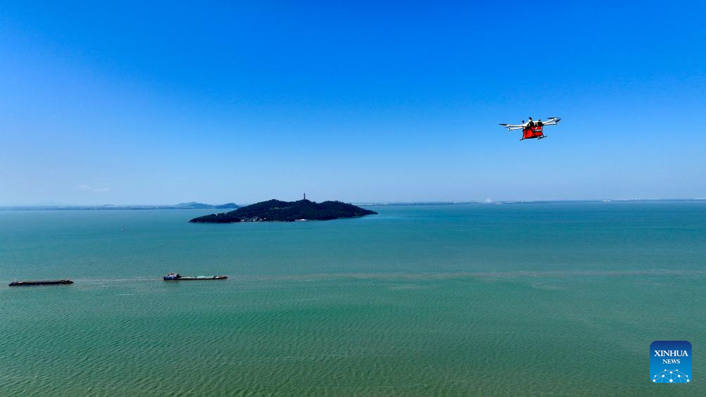 An aerial drone photo taken on Aug. 19, 2025 shows a drone delivering a parcel over Chaohu Lake in Hefei, east China's Anhui Province. (Xinhua/Huang Bohan)
