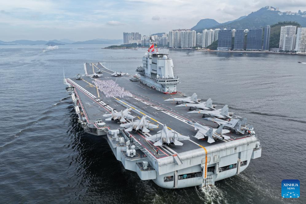 A drone photo taken on July 3, 2025 shows a fleet of the Chinese People's Liberation Army (PLA) Navy led by the aircraft carrier Shandong arriving in Hong Kong, south China. (Photo by Pu Haiyang/Xinhua)