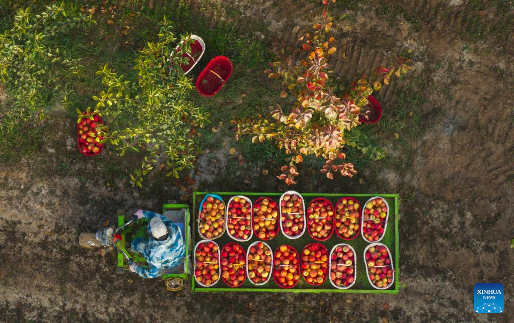 An aerial drone photo taken on Oct. 23, 2025 shows a staff member transporting newly-picked apples at an orchard in Alaer City, northwest China's Xinjiang Uygur Autonomous Region. (Xinhua/Cai Yang)