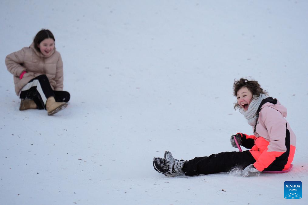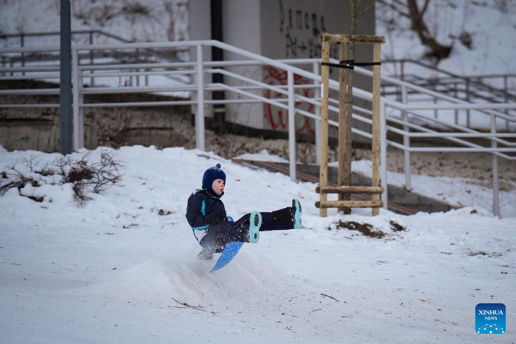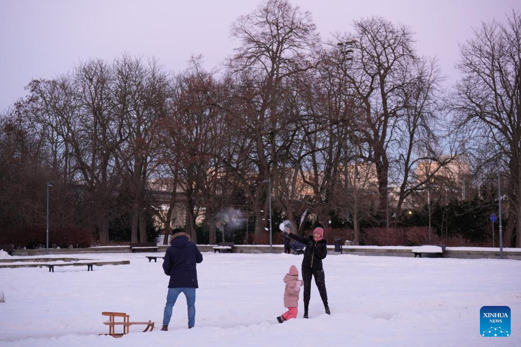 People play in the snow in Warsaw, Poland on Jan. 4, 2026. Warsaw has recently seen continuous snowfall, bringing residents outdoors to enjoy winter activities. (Photo by Jaap Arriens/Xinhua)