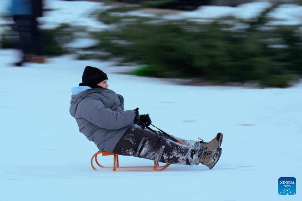 A child rides a sled on a snowy slope at a park in Warsaw, Poland on Jan. 4, 2026. Warsaw has recently seen continuous snowfall, bringing residents outdoors to enjoy winter activities. (Photo by Jaap Arriens/Xinhua)