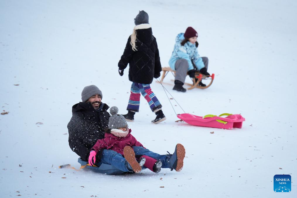 People play in the snow at a park in Warsaw, Poland on Jan. 4, 2026. Warsaw has recently seen continuous snowfall, bringing residents outdoors to enjoy winter activities. (Photo by Jaap Arriens/Xinhua)