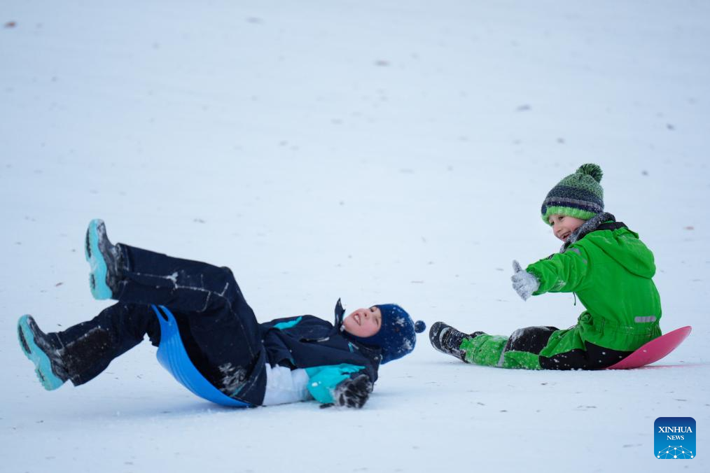 Children play in the snow at a park in Warsaw, Poland on Jan. 4, 2026. Warsaw has recently seen continuous snowfall, bringing residents outdoors to enjoy winter activities. (Photo by Jaap Arriens/Xinhua)
