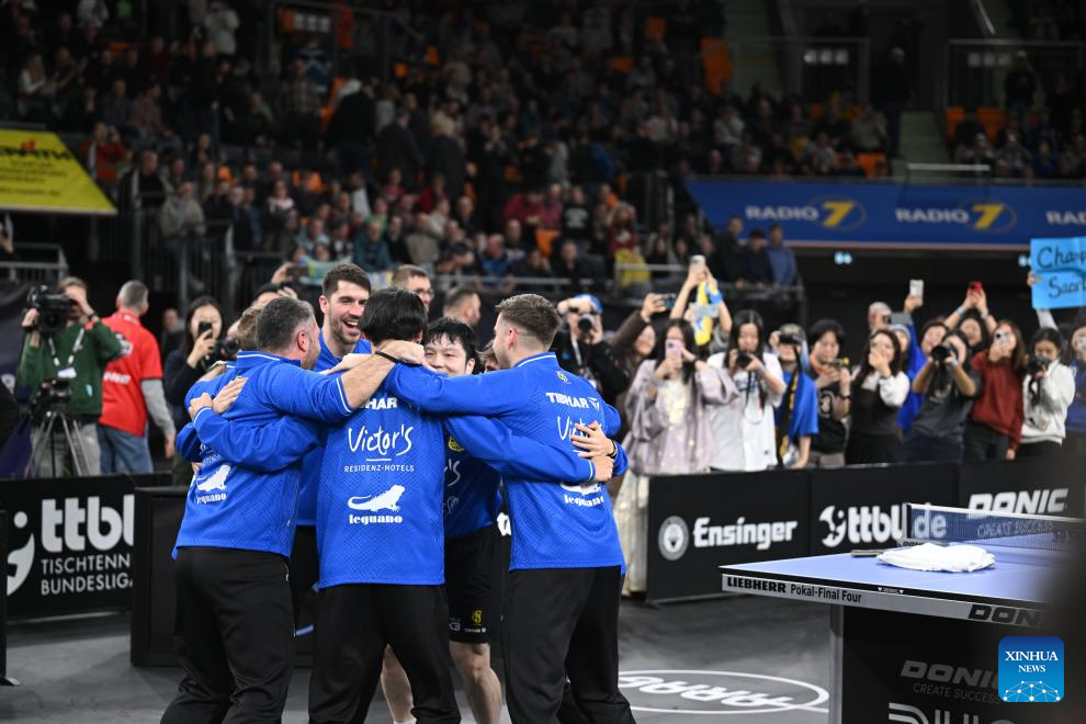 Members of 1. FC Saarbrucken Tischtennis celebrate victory after the final between 1. FC Saarbrucken Tischtennis and TTC RhonSprudel Fulda-Maberzell of Liebherr Pokal table tennis tournament in Neu-Ulm, Germany, Jan. 4, 2026. (Photo by Ulrich Hufnagel/Xinhua)