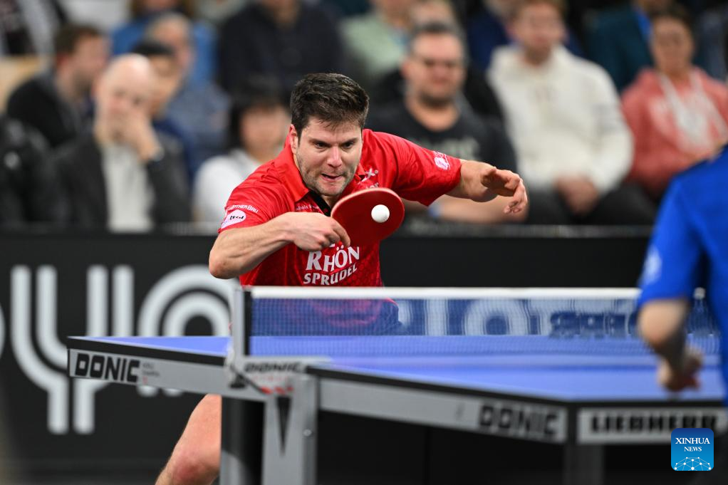 Dimitrij Ovtcharov of TTC RhonSprudel Fulda-Maberzell hits a return in the men's singles match against Fan Zhendong of 1. FC Saarbrucken Tischtennis during the final between 1. FC Saarbrucken Tischtennis and TTC RhonSprudel Fulda-Maberzell of Liebherr Pokal table tennis tournament in Neu-Ulm, Germany, Jan. 4, 2026. (Photo by Ulrich Hufnagel/Xinhua)
