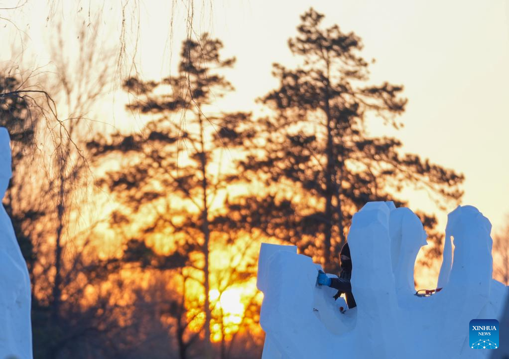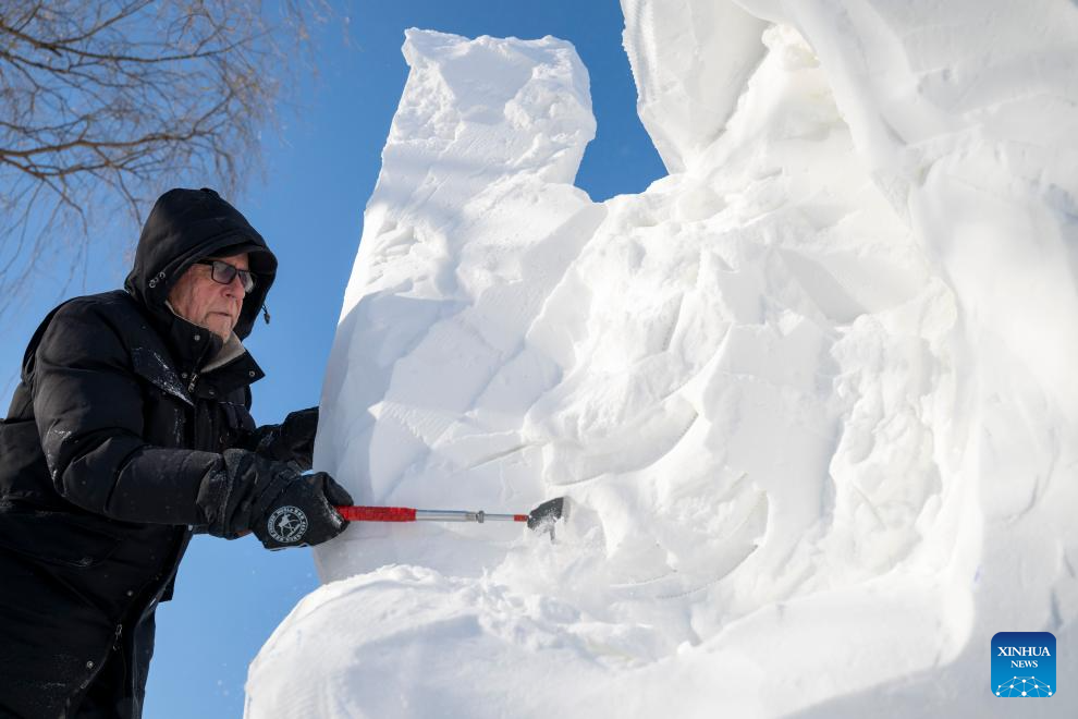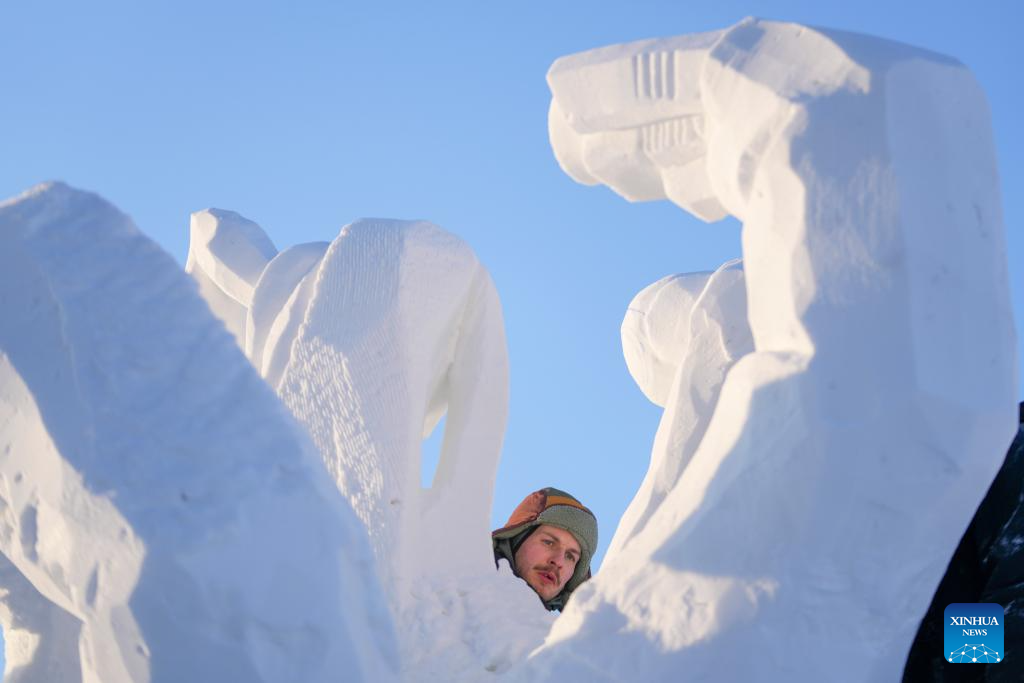 A contestant works on a snow sculpture at the compound for the Sun Island International Snow Sculpture Art Expo in Harbin, northeast China's Heilongjiang Province, Jan. 6, 2026. The 28th Harbin international snow sculpture competition kicked off here on Tuesday, attracting 25 teams of snow sculptors from 13 countries. (Xinhua/Wang Jianwei)