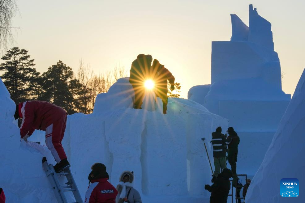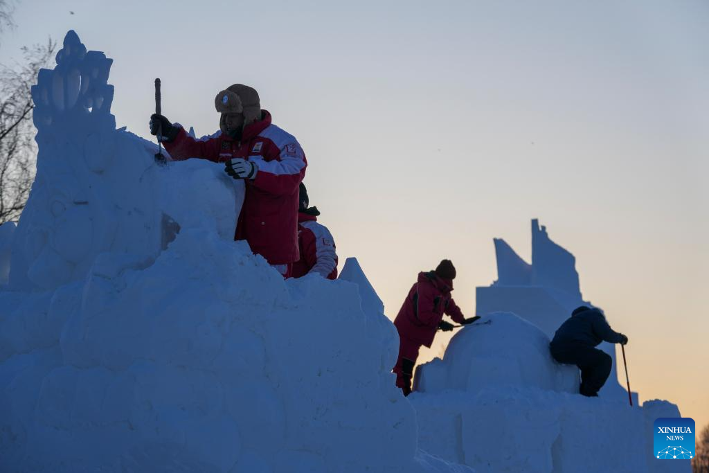 Contestants work on a snow sculpture at the compound for the Sun Island International Snow Sculpture Art Expo in Harbin, northeast China's Heilongjiang Province, Jan. 6, 2026. The 28th Harbin international snow sculpture competition kicked off here on Tuesday, attracting 25 teams of snow sculptors from 13 countries. (Xinhua/Wang Jianwei)