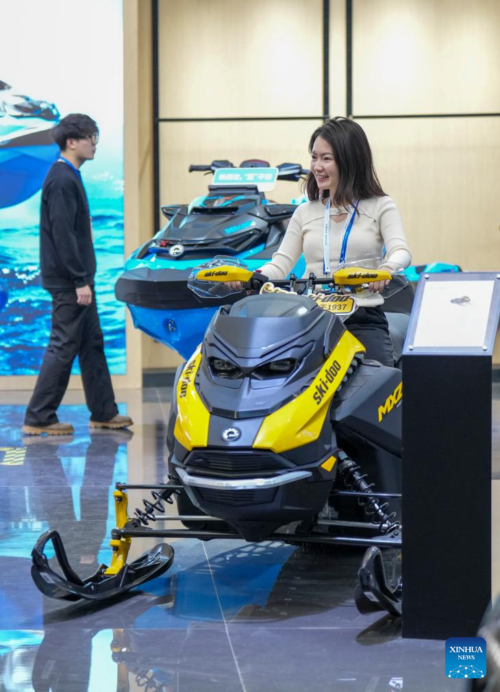 A guest tries a snowmobile at the Harbin International Ice and Snow Economy Expo 2026 in Harbin, northeast China's Heilongjiang Province, Jan. 6, 2026. The three-day expo kicked off here on Tuesday, showcasing cutting-edge achievements of the ice-and-snow industry. (Xinhua/Wang Song)
