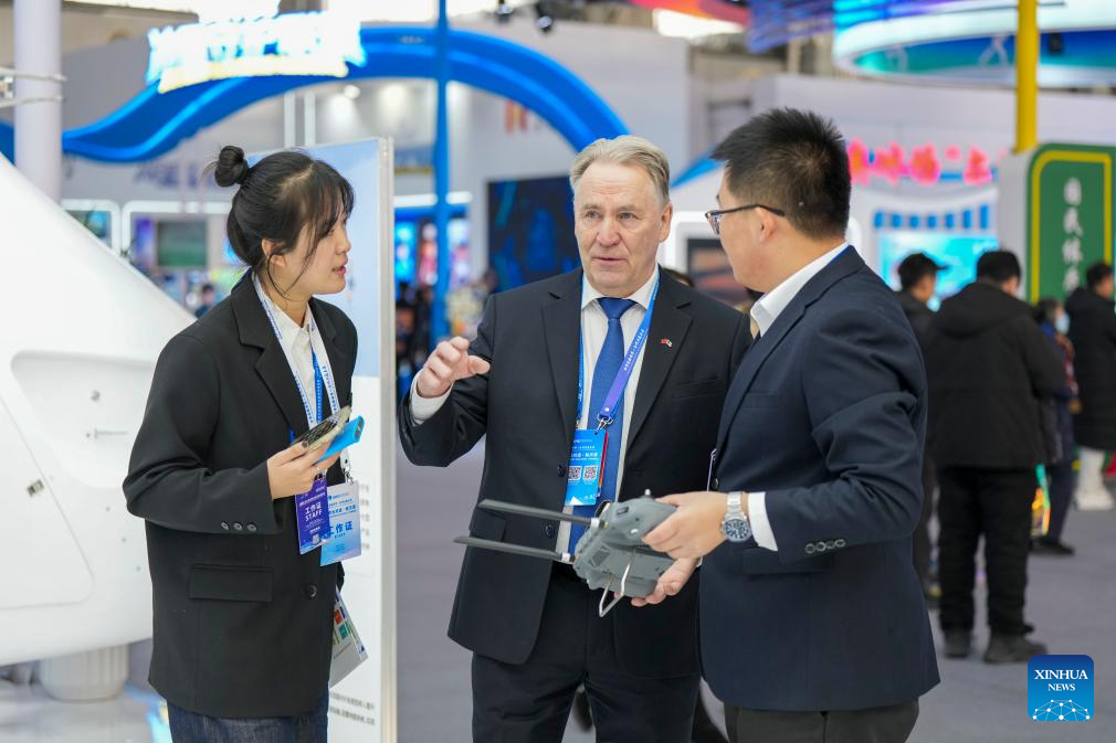 Guests communicate at the Harbin International Ice and Snow Economy Expo 2026 in Harbin, northeast China's Heilongjiang Province, Jan. 6, 2026. The three-day expo kicked off here on Tuesday, showcasing cutting-edge achievements of the ice-and-snow industry. (Xinhua/Zhang Tao)