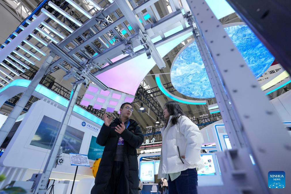 Visitors communicate at the Harbin International Ice and Snow Economy Expo 2026 in Harbin, northeast China's Heilongjiang Province, Jan. 6, 2026. The three-day expo kicked off here on Tuesday, showcasing cutting-edge achievements of the ice-and-snow industry. (Xinhua/Zhang Tao)