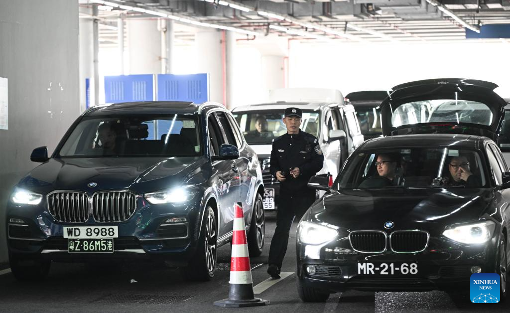 Vehicles wait to be inspected at the Zhuhai port of the Hong Kong-Zhuhai-Macao Bridge in Zhuhai, south China's Guangdong Province, Jan. 6, 2026.