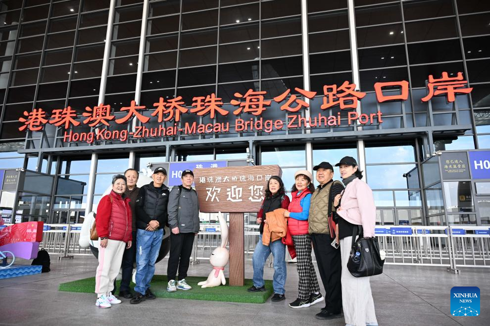 Passengers pose for photos at the Zhuhai port of the Hong Kong-Zhuhai-Macao Bridge in Zhuhai, south China's Guangdong Province, Jan. 6, 2026.