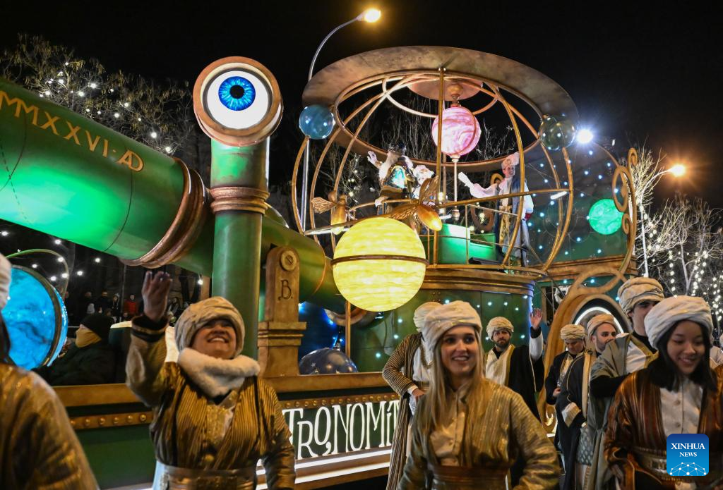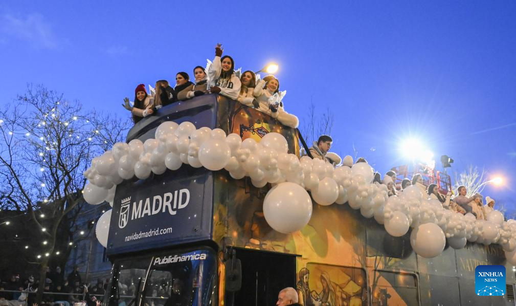A grand Three Kings Day float parade was held in Madrid on Monday, drawing thousands of people to watch. (Xinhua/Meng Dingbo)