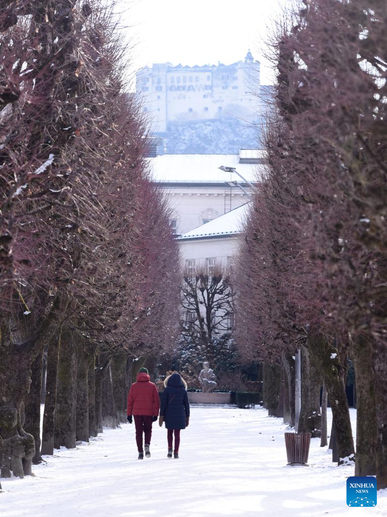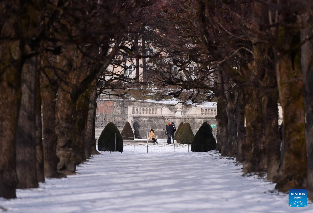 People walk at the Mirabell Palace & Garden in Salzburg, Austria, Jan. 7, 2026. An Arctic blast has brought heavy snow and widespread ice across Europe, disrupting travel and public services across large parts of the continent. (Xinhua/He Canling)