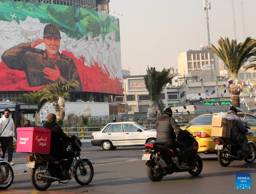 People drive past a billboard depicting Qassem Soleimani, former commander of the Islamic Revolutionary Guard Corps (IRGC) Quds Force, in downtown Tehran, Iran, Jan. 6, 2026. Iran's army chief warned on Wednesday that the country will respond if hostile rhetoric by its "enemies" continues, according to the official IRNA news agency. (Xinhua)