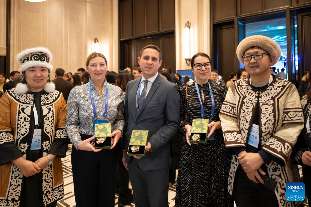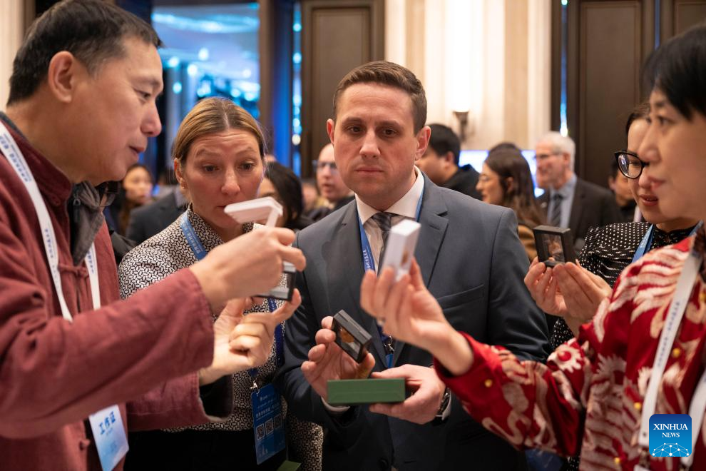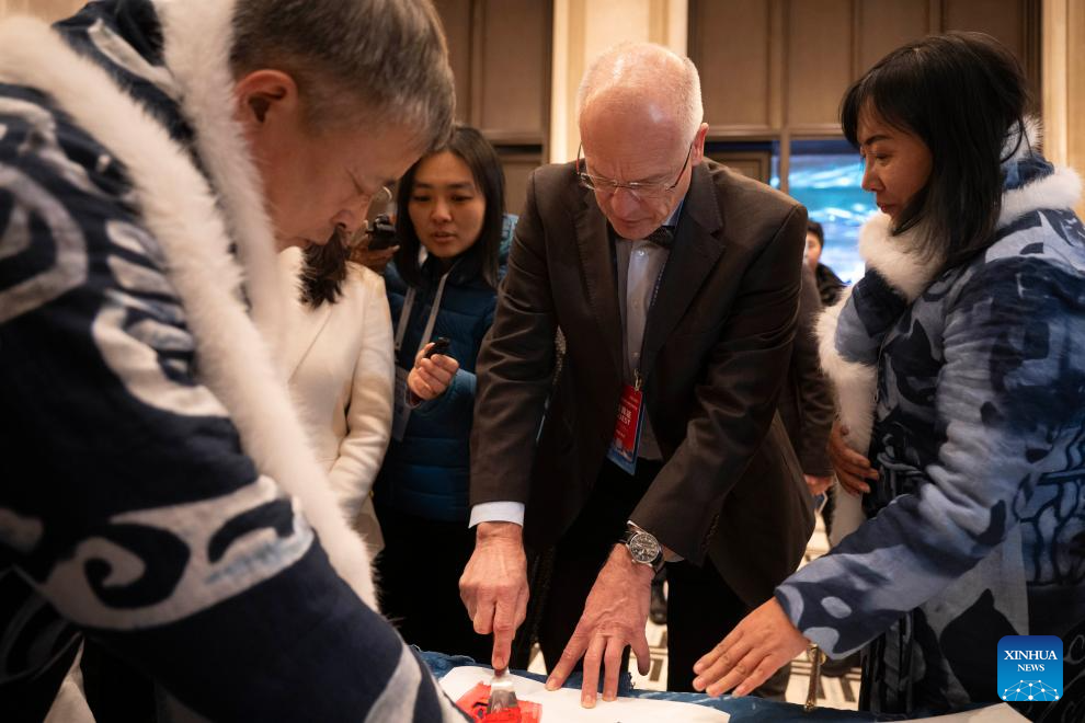 Representatives learn about the intangible cultural heritage works at the main dialogue session of the "Global Mayors Dialogue in Harbin" in Harbin, northeast China's Heilongjiang Province, Jan. 7, 2026. (Xinhua/Zhang Tao)