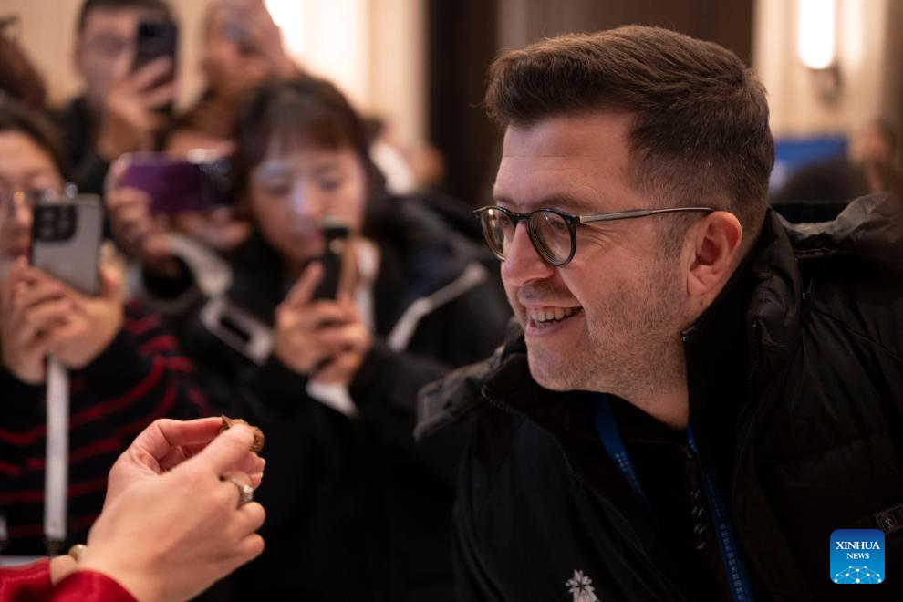 A representative tries to create an intangible cultural heritage work at the main dialogue session of the "Global Mayors Dialogue in Harbin" in Harbin, northeast China's Heilongjiang Province, Jan. 7, 2026. (Xinhua/Zhang Tao)