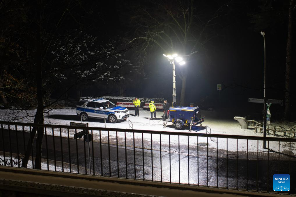 Police officers stand guard by an emergency lighting unit during a power outage at Nikolassee area in Berlin, Germany, Jan. 6, 2026. Thousands of households, as well as supermarkets, shops, restaurants and other businesses in southwest Berlin, still remained without power on Tuesday, as crew continued repairs to restore electricity after an attack on the grid left parts of the German capital in the dark for a fourth consecutive day. (Xinhua/Zhang Haofu)