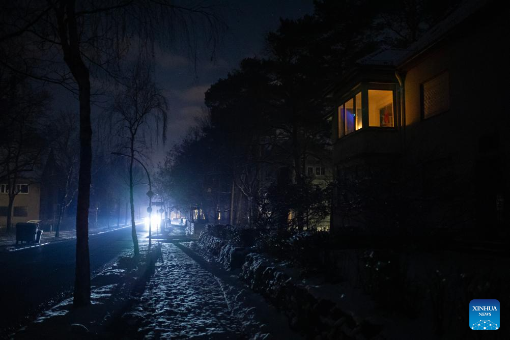 A moving vehicle lights up a street during a power outage at Nikolassee area in Berlin, Germany, Jan. 6, 2026. Thousands of households, as well as supermarkets, shops, restaurants and other businesses in southwest Berlin, still remained without power on Tuesday, as crew continued repairs to restore electricity after an attack on the grid left parts of the German capital in the dark for a fourth consecutive day. (Xinhua/Zhang Haofu)