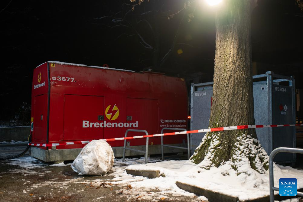 Photo taken on Jan. 6, 2026 shows a power generator at work during a power outage at Nikolassee area in Berlin, Germany. Thousands of households, as well as supermarkets, shops, restaurants and other businesses in southwest Berlin, still remained without power on Tuesday, as crew continued repairs to restore electricity after an attack on the grid left parts of the German capital in the dark for a fourth consecutive day. (Xinhua/Zhang Haofu)