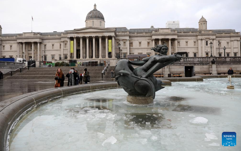 Fountain water at Trafalgar Square is partially frozen in London, Britain, Jan. 6, 2026. Amber cold weather alerts remain in force for England through Friday, with snow, ice, strong winds and heavy rain expected to bring further hazards later in the week. (Xinhua/Li Ying)