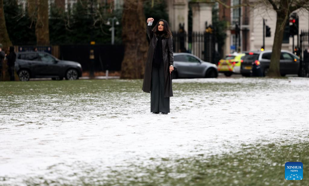 A woman takes a selfie in London, Britain, Jan. 6, 2026. Amber cold weather alerts remain in force for England through Friday, with snow, ice, strong winds and heavy rain expected to bring further hazards later in the week. (Xinhua/Li Ying)