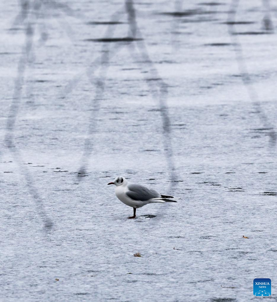 A bird stands on a frozen lake at St. James's Park in London, Britain, Jan. 6, 2026. Amber cold weather alerts remain in force for England through Friday, with snow, ice, strong winds and heavy rain expected to bring further hazards later in the week. (Xinhua/Li Ying)