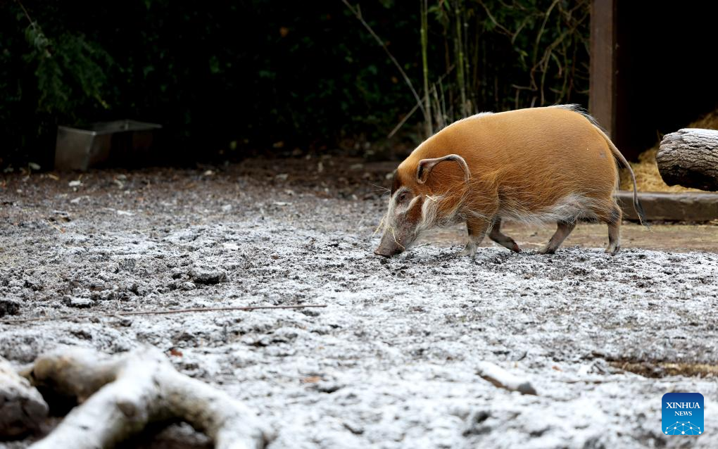 A red river hog forages on frosty ground at London Zoo in London, Britain, Jan. 6, 2026. Amber cold weather alerts remain in force for England through Friday, with snow, ice, strong winds and heavy rain expected to bring further hazards later in the week. (Xinhua/Li Ying)