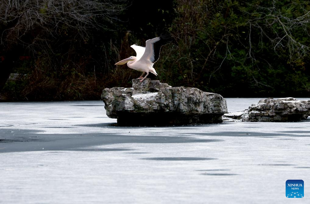 A pelican is seen on a rock surrounded by the frozen surface of the lake at St. James's Park in London, Britain, Jan. 6, 2026. Amber cold weather alerts remain in force for England through Friday, with snow, ice, strong winds and heavy rain expected to bring further hazards later in the week. (Xinhua/Li Ying)